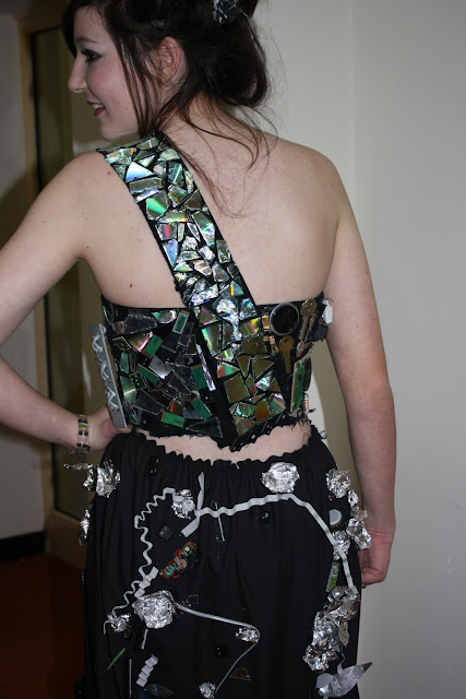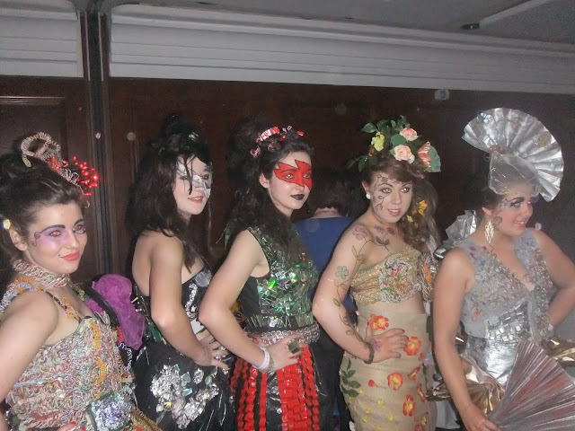 [/lang_ie][lang_en-uk]This is an event where the complete emphasis is on recycling material to create new fashion items. Also anyone on the day who arrived with 20 batteries had £5 deducted from their entry fee. Buncrana and Glengad Youthreach and several schools here in the North-West (among them Crana College (see YouTube below), Deele College, Abbey VS, Coláiste Ailigh and Errigal College) took part in this amazing fashion event called Junk Kouture and was held in the Europa Hotel in Belfast. The event was sponsored by ERP (European Recycling Platform). Over 70 dresses were entered from schools all over Northern Ireland and Co.Donegal and with a very high standard indeed. Nadine Doherty, Debbie Burns and Shannon McDaid represented Buncrana Youthreach and were assisted by their art teacher Claire Harkin. They really enjoyed their day and their effort where Nadine modelled their dress entry called Twist of Modern Organic. 20 dresses were singled out to go to the final in the Citywest Hotel in Dublin in April. A piece designed by Clodagh Barry, Catherine Donnelly agus Leona Burns in Deele College called ‘Short Circuit’ and made completely from stripped wire and electrical components has been picked to enter the finals in Dublin. Well done everyone for your efforts and creativity.